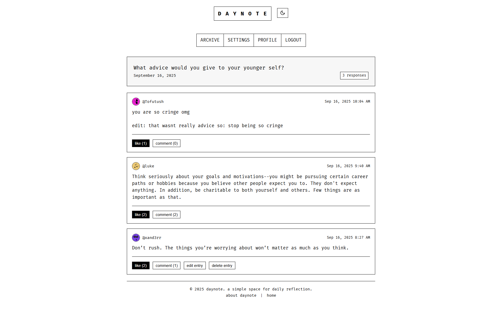 Another thing is that it might be helpful to toggle anonymity on/off for specific entries. For instance, say I journal a bit every day. But, some entries might be much more personal, and I might not want others to track it back to me. It might be helpful to have a filter for this (as well as profile privacy settings).
