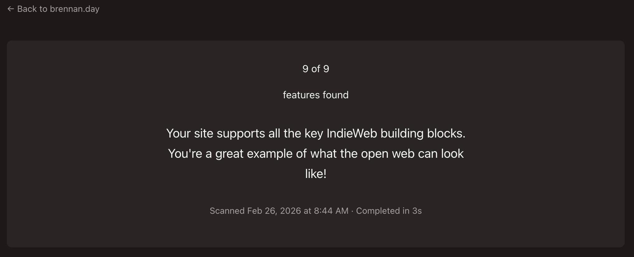 I put together a tool that let’s you scan your website and it checks for various common IndieWeb patterns and features, and if you don’t have them directs you towards where to find out more.