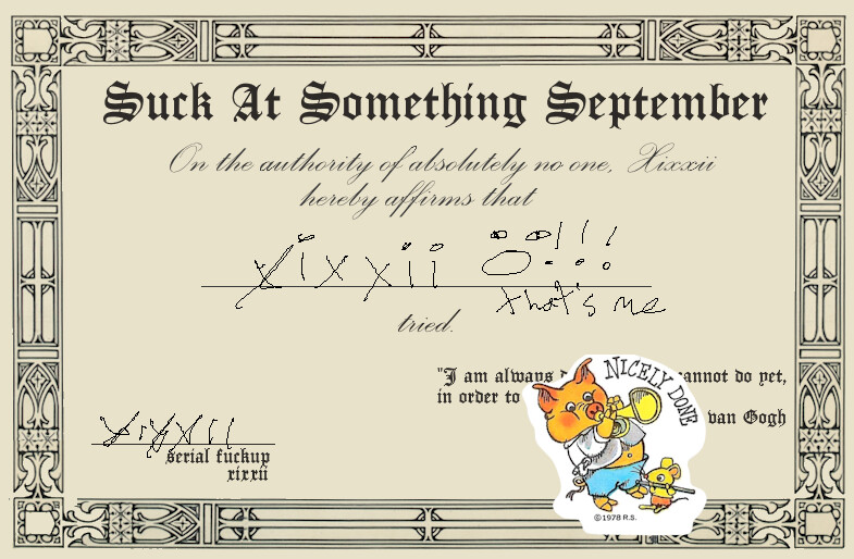 - an award certificate celebrating their participation in Suck At Something September