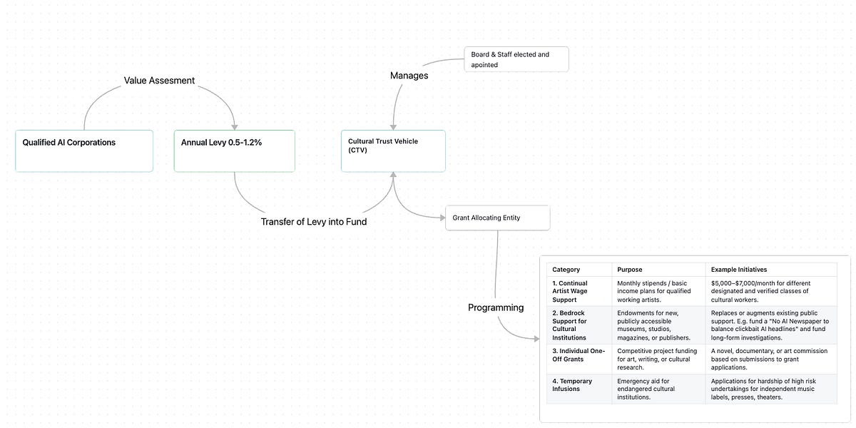 mike pepi (imo the best tech critic in the game atm) recently dropped this piece about a theoretical policy proposal to force AI companies to contribute financially to the cultural production their machines use as training data. the proposal is definitely an early draft, but i found it very interesting and wanted to share it here to see what people thought of it.