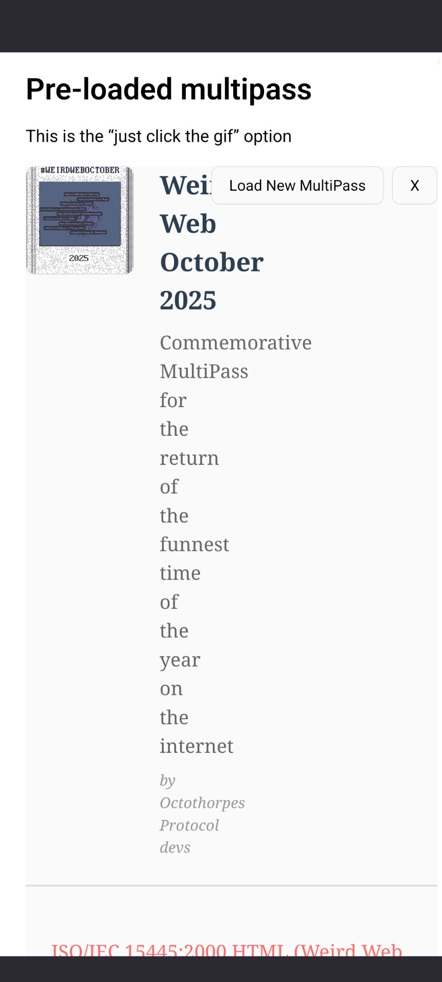 I’m one of the devs behind Octothorpes and we just launched a way to save and share collections of sites you find with Octothorpes into a thing we’re calling MultiPass. We’re hoping it can be like a mixtape for websites. And you can put them in a gif. Like, if you have the gif, you have the collection, and you can just drop it on the Explore page. Here’s the first one, which collects all the #weirdweboctober sites for 2025. Just launched a new toy built on Octothorpes called MultiPass that’s like a mixtape for websites. Here’s a short demo MultiPass early demo – Tapes and a full explainer with MultiPasses you can try: Introducing the OP MultiPass