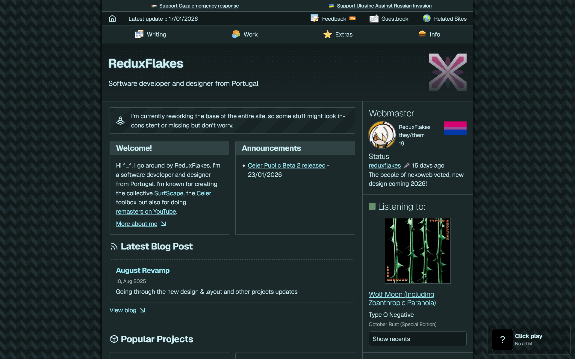 Hi everyone! A few months back I’ve shared a design that I was working for my website and how it wasn’t going well. Fast forward a bit and I got the design and layout I finally wanted however since I’m currently on a creative burst and it’s a new year I’ve decided to rework on the site, this time just adding new features, fixing/cleaning up the code since the template is a mess, and do some tweaks on the design. I’ve attached below two images of the current design and two other images of the new WIP version.