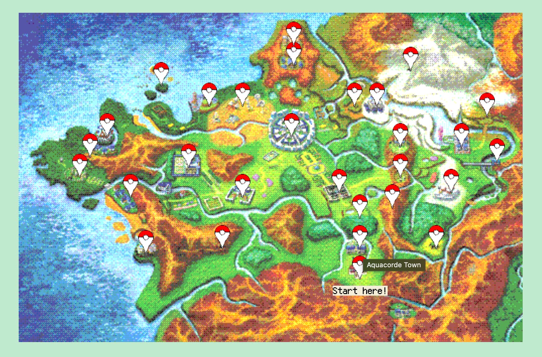 working on the kalos section of my pokƩmon shrine! eventual goal is to be able to click on each pin and learn about that location and my personal relation to it or why that location is important to the region