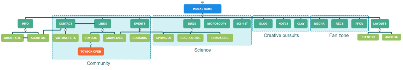i’ll start! my goal is to have my site become a sprawling labyrinth that rewards exploration, so i was looking for ways to visualize just how labyrinthine it is. first, i used this flowchart making tool to make a map of the pages i have so far and the links between them.